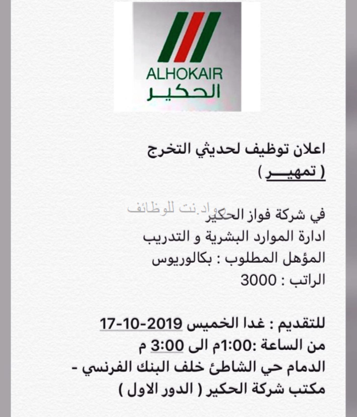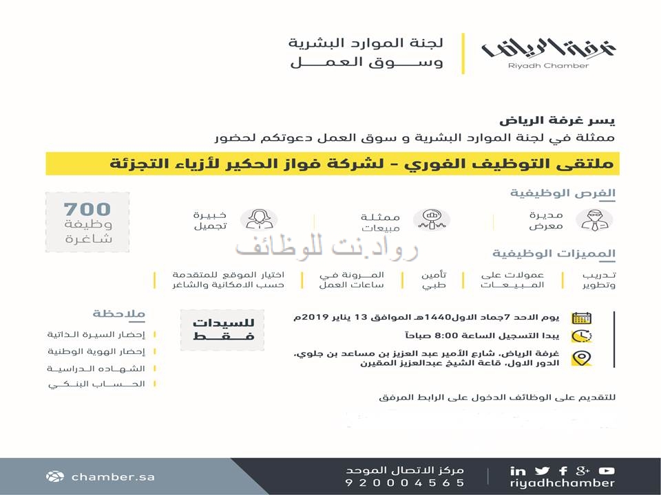 شركة فواز الحكير للتوظيف. أعلنت شركة فواز الحكير للتجزئة عن توفر وظائف فورية للرجال و للنساء للعمل بفروع الشركة في المناطق الموضح أدناه وحسب الشروط المبينة لكل وظيفة. وظائف في مجموعة الحكير بحث browse all jobs alhokair group hotels jobs. كشفت مصادر مطلعة في بيان رسمي عن رغبة شركة فواز الحكير في طرح عدد من الوظائف الفورية وذلك لما يقرب من 1500 وظيفة للسعوديين فقط على مستوى المملكة العربية السعودية. 200 للرياض 50 للخبر مجمع الظهران 20 عنيزة 100 جدة الموقع في الرياض مكتب شركة فواز الحكير للتدريب الدور السادس شارع الضباب بإتجاه الجنوب الغرفه التجارية علي اليسار بعد الإشارة خلف مكتب بدجت لتأجير السيارات من.