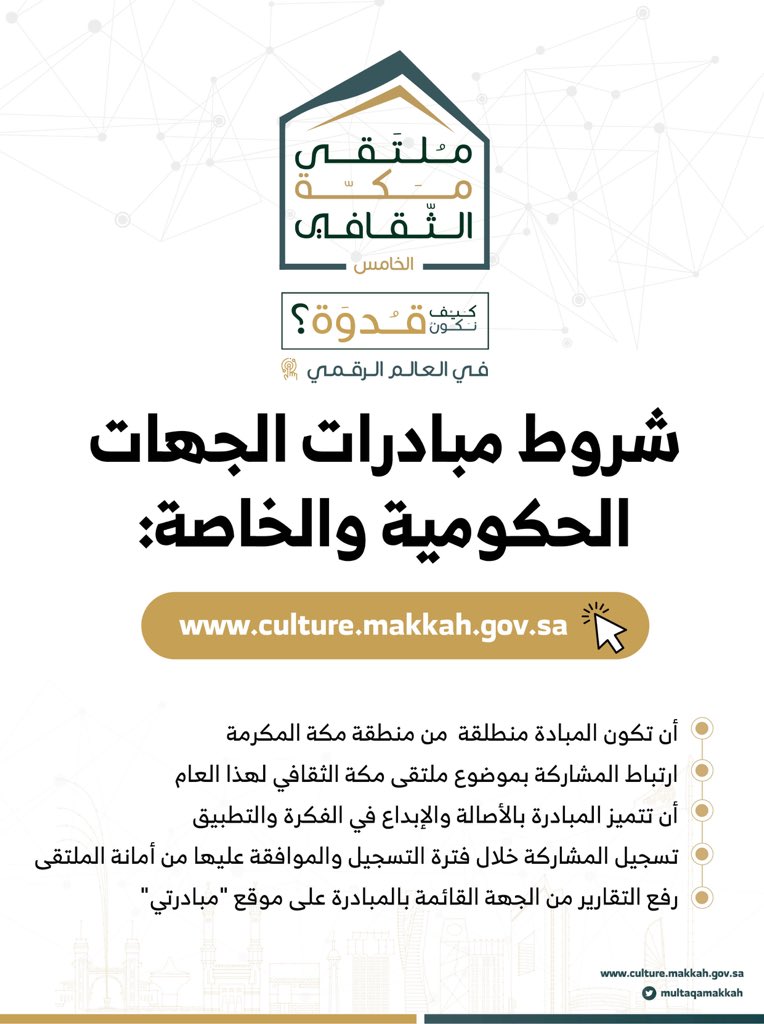 أعلن مستشار خادم الحرمين الشريفين أمير منطقة مكة المكرمة صاحب السمو الملكي الأمير خالد الفيصل عن موضوع ملتقى مكة الثقافي تحت شعار كيف نكون قدوة للعام المقبل والذي سيكون كيف نكون قدوة بلغة القرآن جاء ذلك لدى. تبني شعار سنوي تقتبس منه الفعاليات والأنشطة والبرامج روحها وهويتها لتوحيد الرسائل الموجهة لإنسان المنطقة وسيكون الشعار الذي يتبناه الملتقى لهذا العام كيف نكون قدوة.