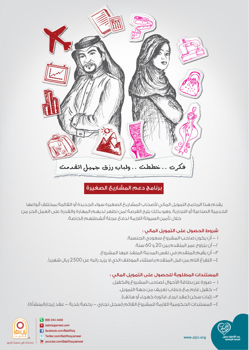 عبداللطيف جميل لدعم المشاريع. يقدم باب رزق جميل فرصة التمويل لأصحاب المشاريع الغير قادرين على الحصول على تمويل من مصادر تقليدية وذلك من خلال عملية سهلة للغاية ومتاحة للجميع بدون عناء. كل ماتودين معرفته عن صندوق عبداللطيف جميل لدعم مساء الخير صبايا كثير اشوف استفسارات عن صندوق عبداللطيف جميل فقلت اوضحلكم الامور من واقع تجربة. تقوم شركة عبد اللطيف جميل المتحدة للتمويل بتمويل جميع أنواع السيارات الجديدة والمستعملة وكذلك الأجهزة المنزلية و الإلكترونيات وبعض أنواع المعدات الثقيلة من خلال نظامي الإيجار التمويلي أو المرابحة ضمن الشروط. ماهي المشاريع التي يدعمها باب رزق جميل.