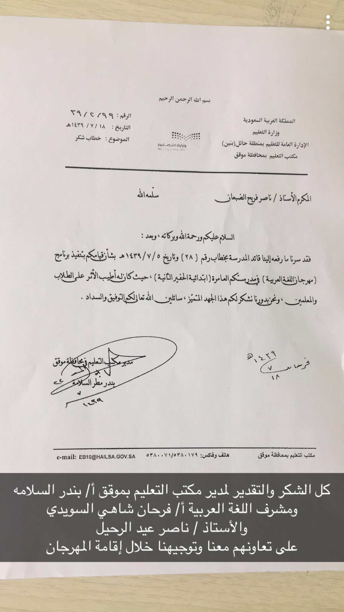 كلمة شكر لمدير المدرسة والمعلمين
